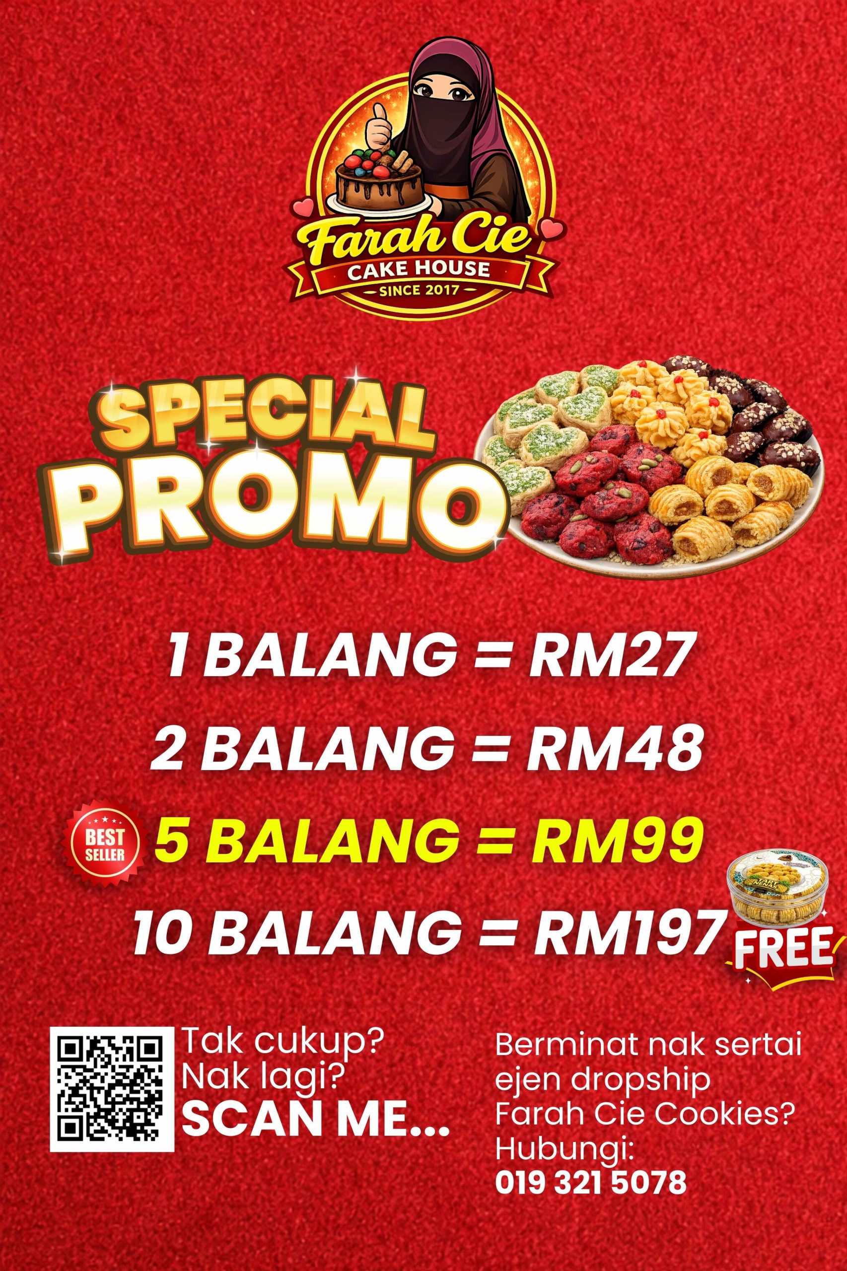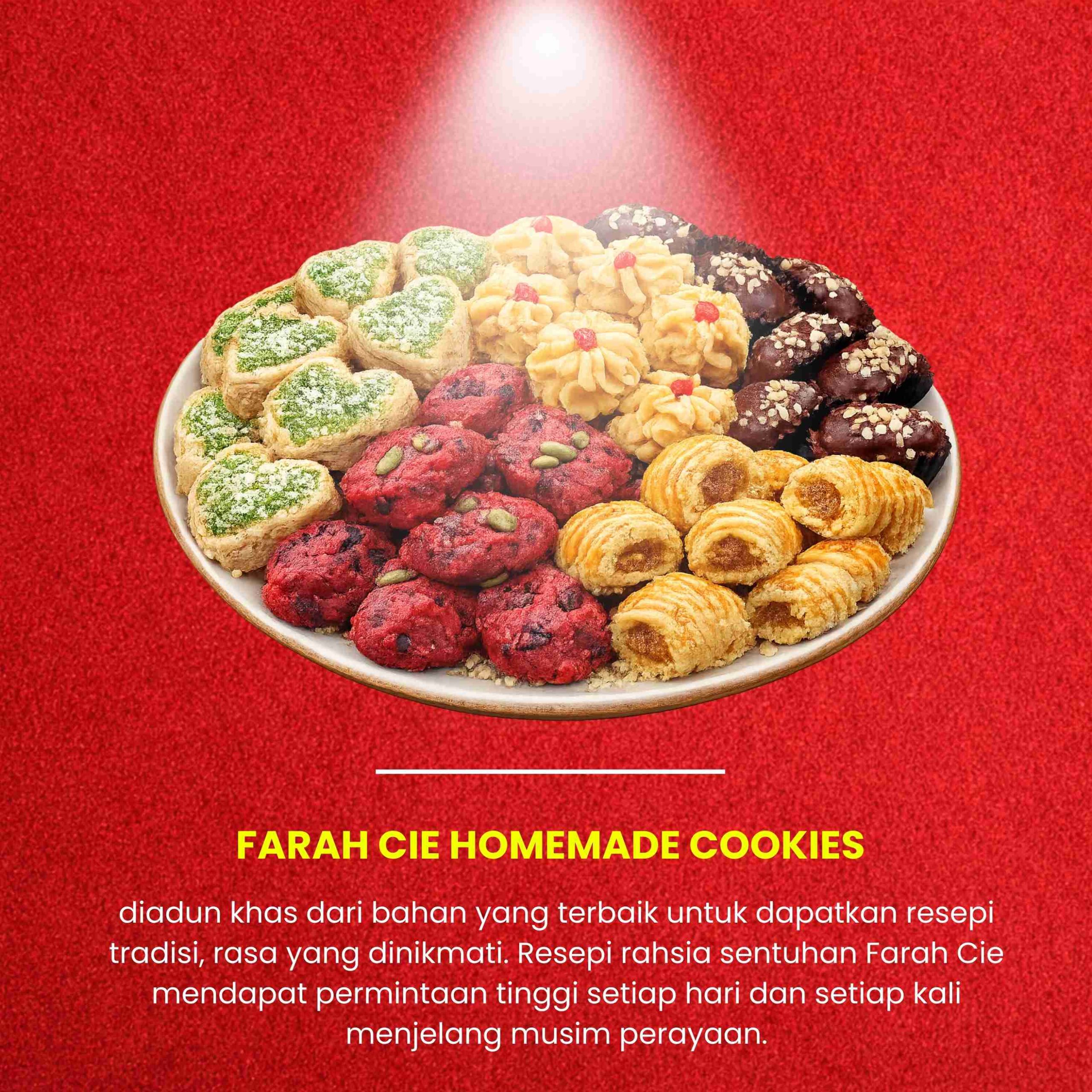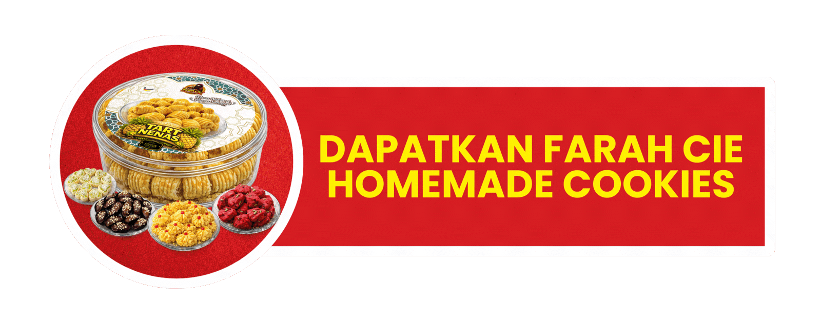 Perhatian! Anda boleh dapatkan homemade biskut raya terus dari Farah Cie. Kami adalah 100% bumiputera Malaysia, pengusaha homemade cbiskut raya. Diyakini Halal dan telah beroperasi sejak 2017.